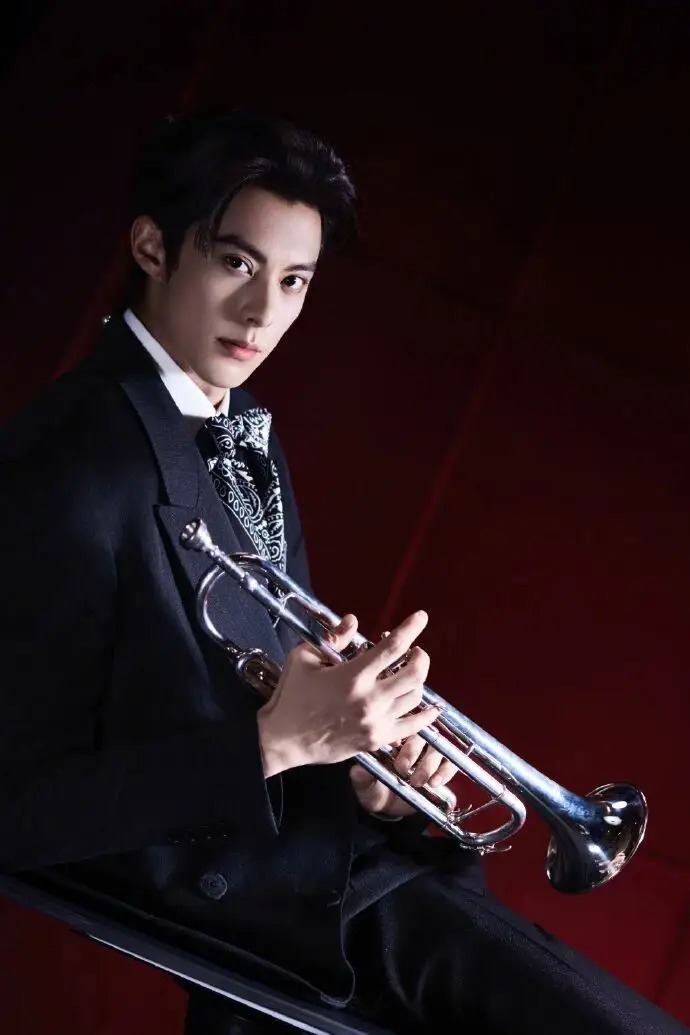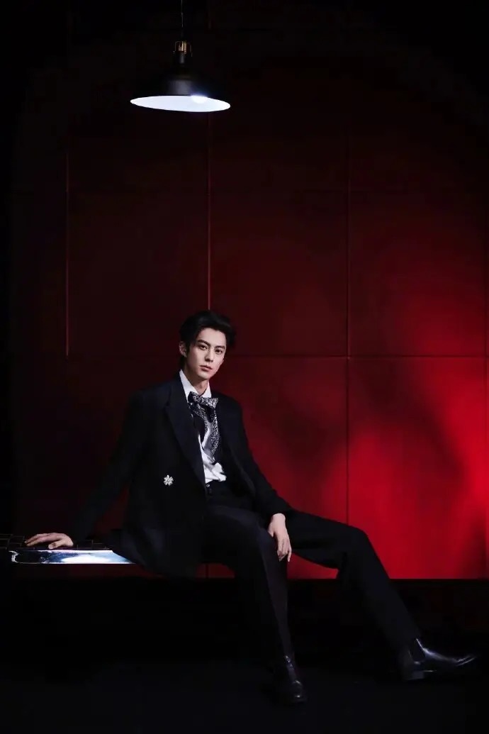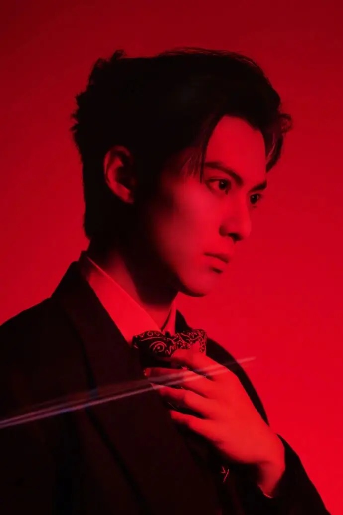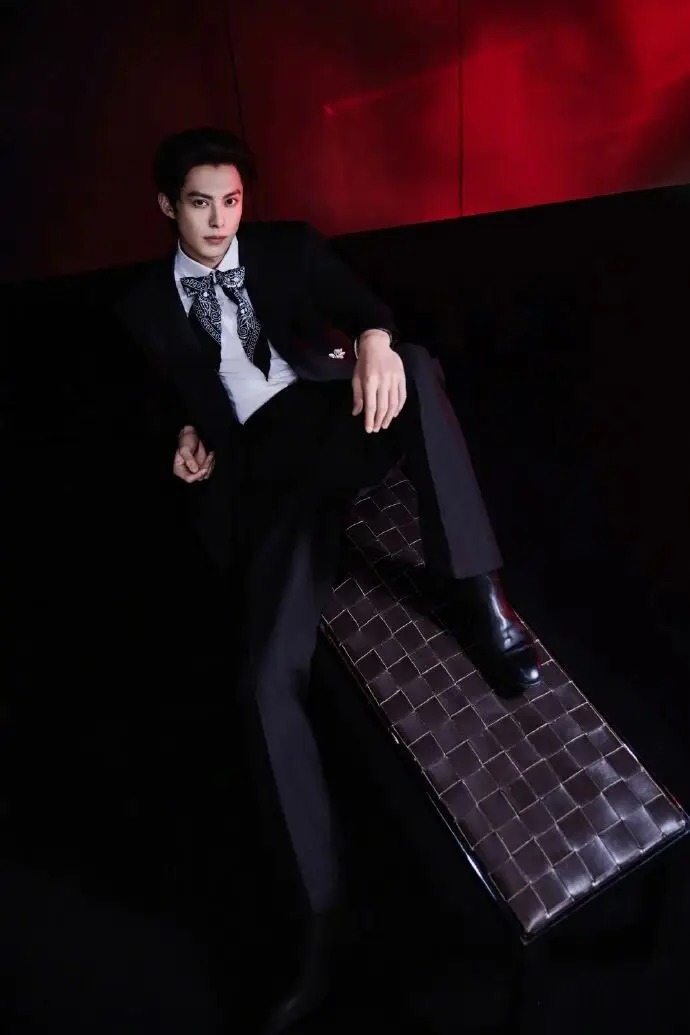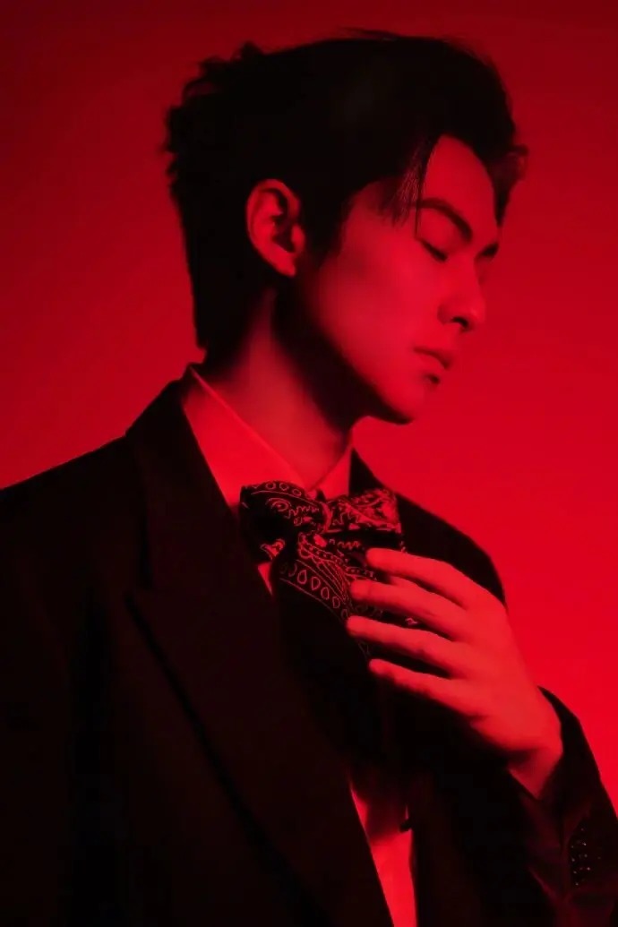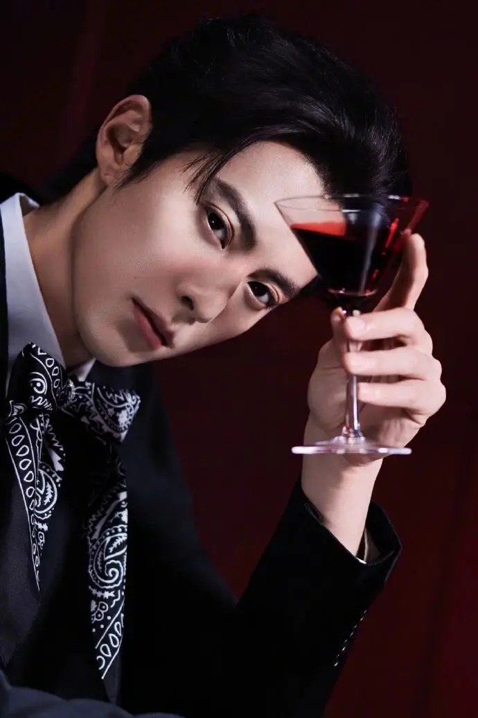 手持酒杯的画面并非刻意摆拍。指尖轻捏杯脚的松弛、倚坐时的随性,乃至眼神里的浅淡锐利,都使造型摆脱了 “穿西服” 的刻意感。红背景的浓郁与黑西服的冷冽相互碰撞,恰好营造出 “醇酒配冷冽绅士” 的张力,仿佛他本就是习惯了这种氛围的俊朗公子,造型并非外在的穿着,而是与气质浑然一体。