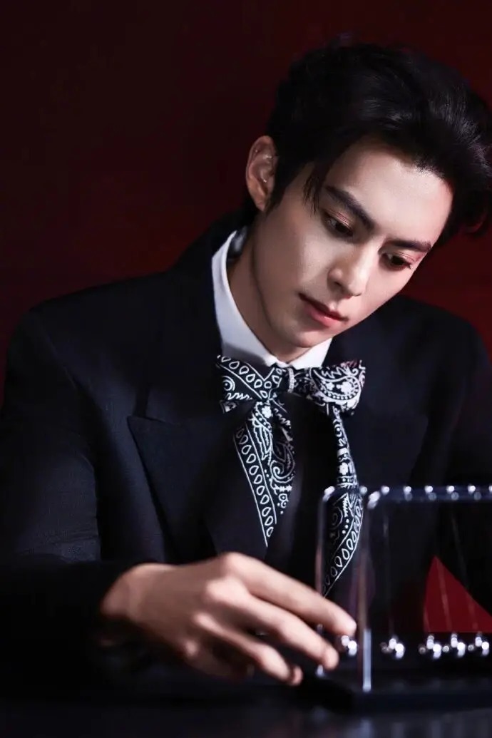 #王鹤棣品牌活动造型 #黑西服绅士风 #印花领巾造型细节 #锋利与醇香造型